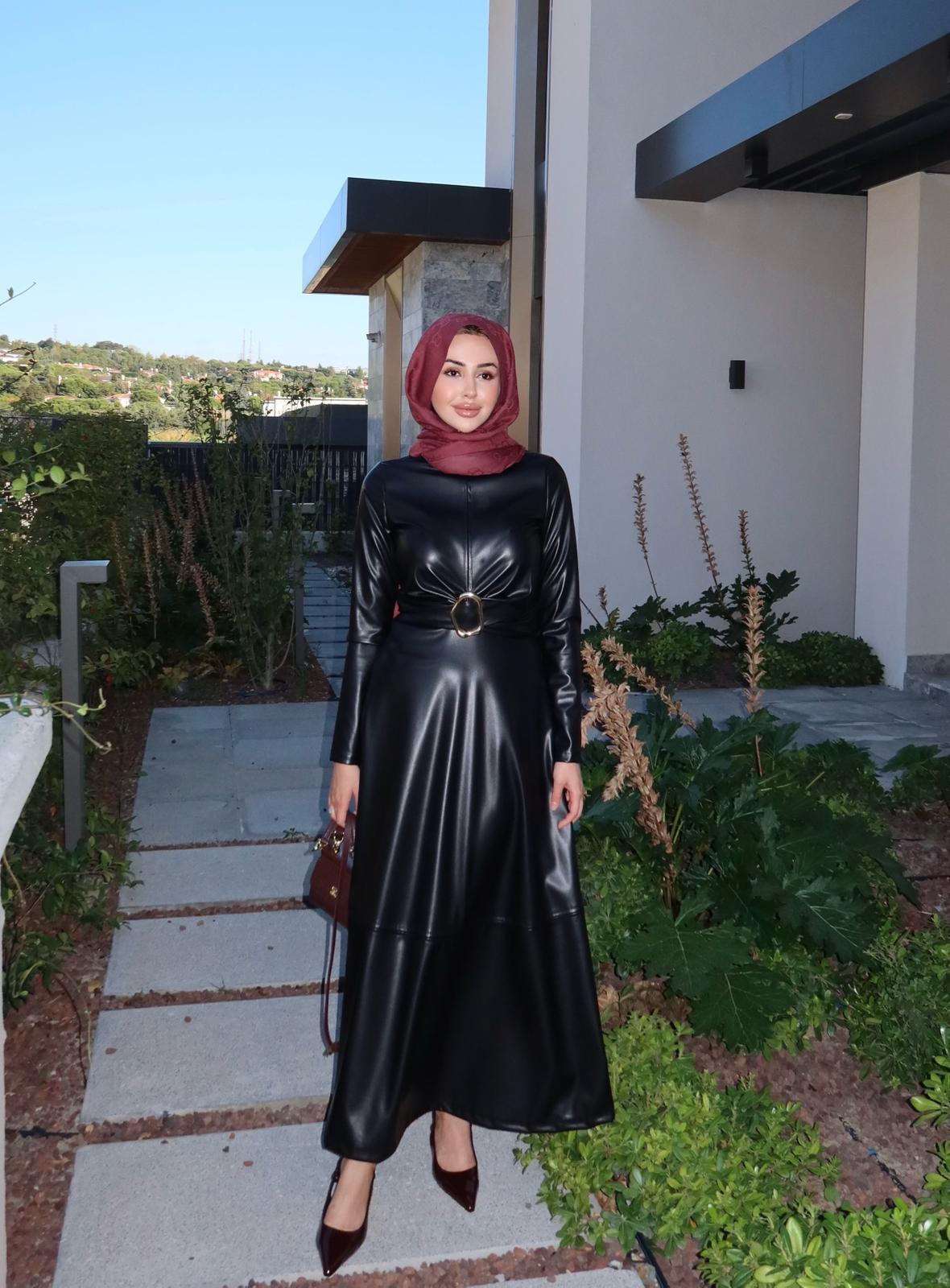 Deri kumaştır, yakası yuvarlak yakadır ,önündeki kemer drapeli olup elbise ile birleşiktir, sırtı fermuarlıdır