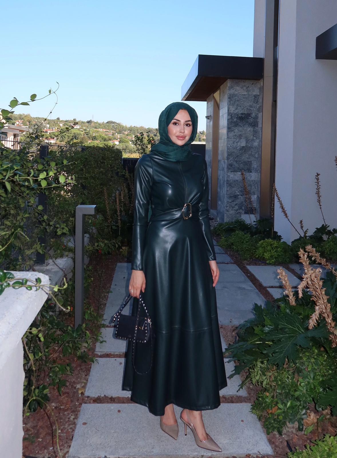 Gold Tokalı Deri Elbise Zümrüt Yeşili
